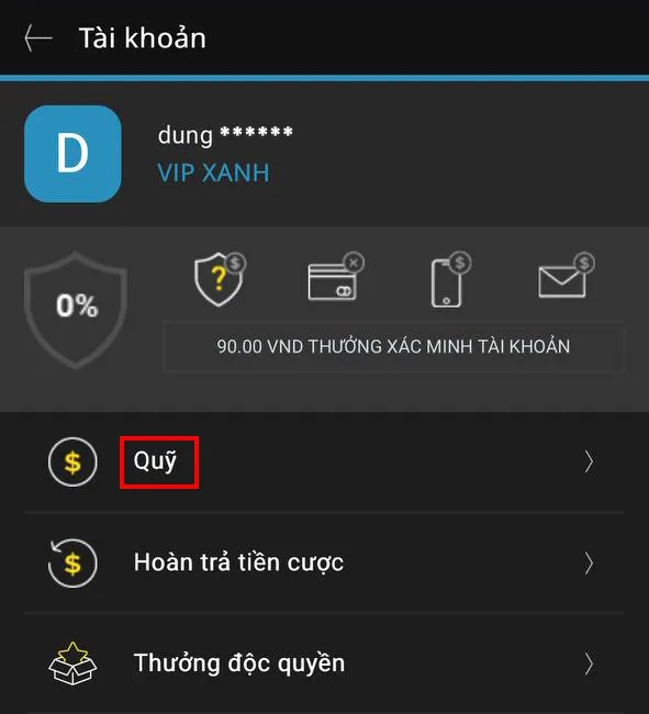 Hệ thống sẽ chuyển bạn đến trang quản lý tài khoản tổng quát. Tại danh sách các lựa chọn, bạn tìm và nhấn vào mục Quỹ để quản lý số dư và các lệnh giao dịch tài chính.
