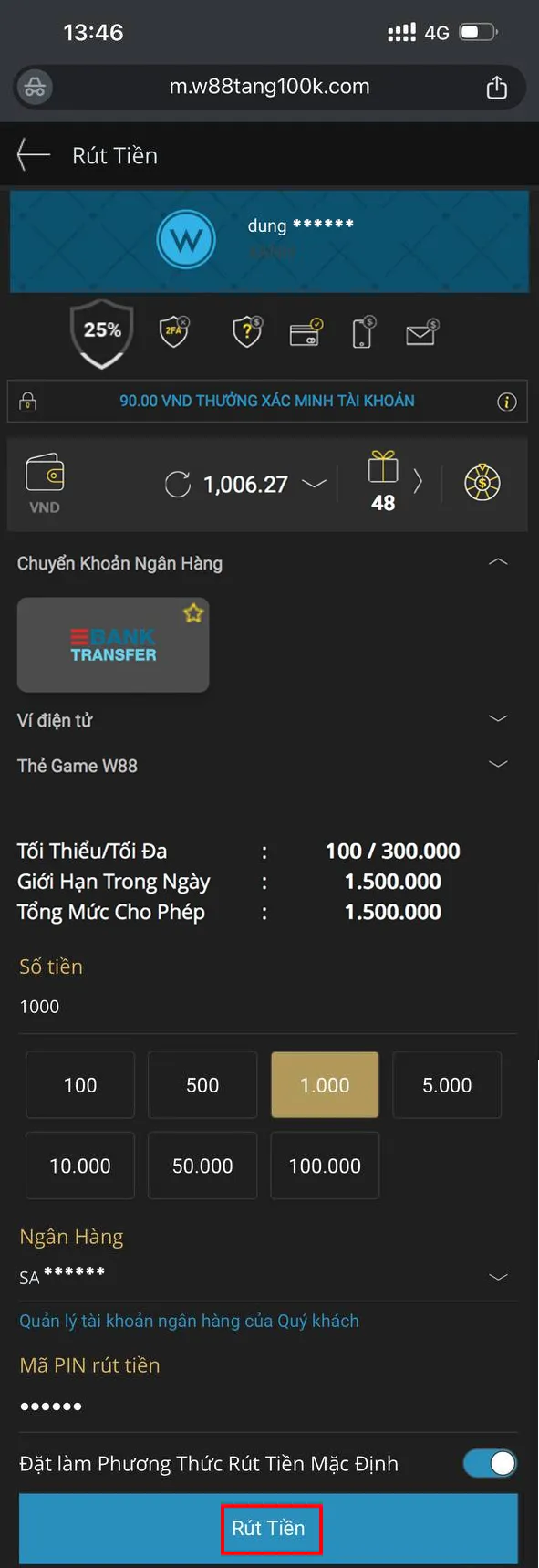 Niềm vui lớn nhất của người chơi là khi giành chiến thắng và rút tiền W88 về tài khoản cá nhân. Nhà cái W88 hỗ trợ hệ thống rút tiền tự động cực kỳ bảo mật và minh bạch. Quy trình này được thiết kế để đảm bảo tiền được gửi chính xác đến chủ tài khoản. Hãy cùng theo dõi các bước thực hiện dưới đây.